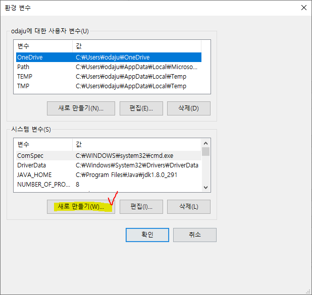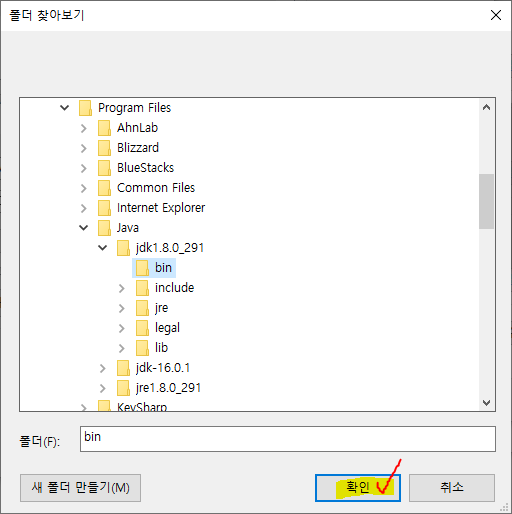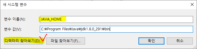 변수 값 : 디렉터리 찾아보기 - java가 설치된 경로로 가서 bin폴더 클릭 - 확인