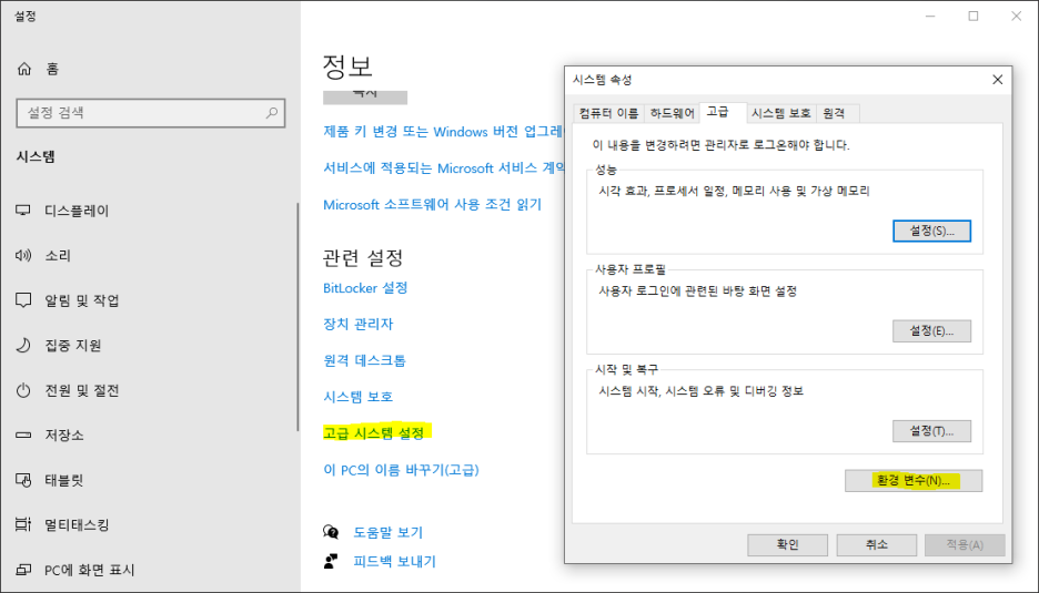 ① 내 PC 우클릭 - 속성 - 고급 시스템 설정 - 환경 변수